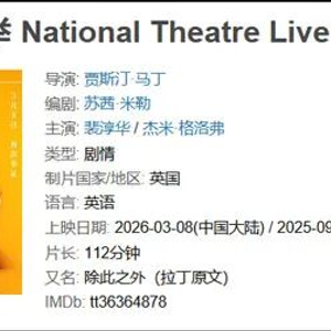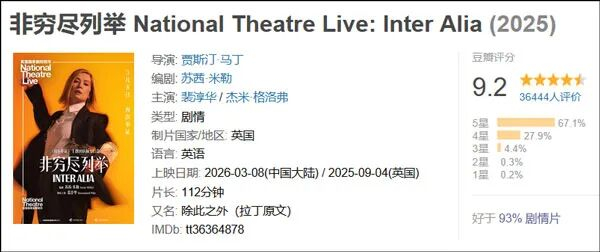 刚刚过去的周末,2026年目前为止中国内地院线上映的最高分电影诞生了——英国演员裴淳华(Rosamund Pike)主演的舞台纪录电影《非穷尽列举》,豆瓣9.2分。