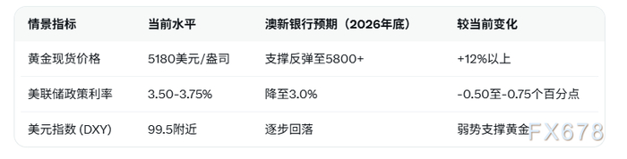 回答:澳新银行基本情景显示,2026年12月底政策利率降至3.0%,较当前3.50-3.75%区间累计降息0.50-0.75个百分点。这将大幅降低持有黄金的机会成本,刺激投资流入。报告强调较低利率环境直接利好非收益资产,结合美元弱势,预计推动黄金价格重回5800美元/盎司以上水平。
