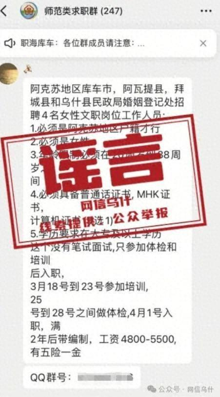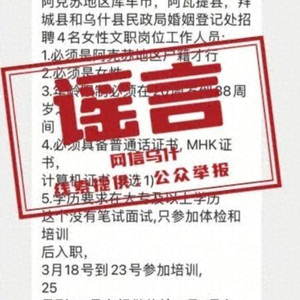 近日,有一则“乌什县民政局婚姻登记处招聘4名女性文职人员”的招聘信息在网络流传,引发求职者关注咨询。经阿克苏地区乌什县民政局核实,该局从未发布此类招聘公告,亦未授权任何个人或机构代为发布。请广大求职者提高警惕,通过官方平台和权威媒体获取招聘信息。