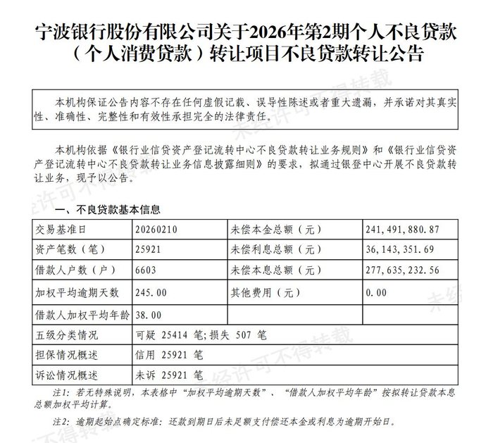 更早之前,宁波银行也公开转让不良贷款,类型为个人消费贷款,未偿本息总额达2.78亿元,其中共包含6603户借款人,借款人加权平均年龄为38岁。