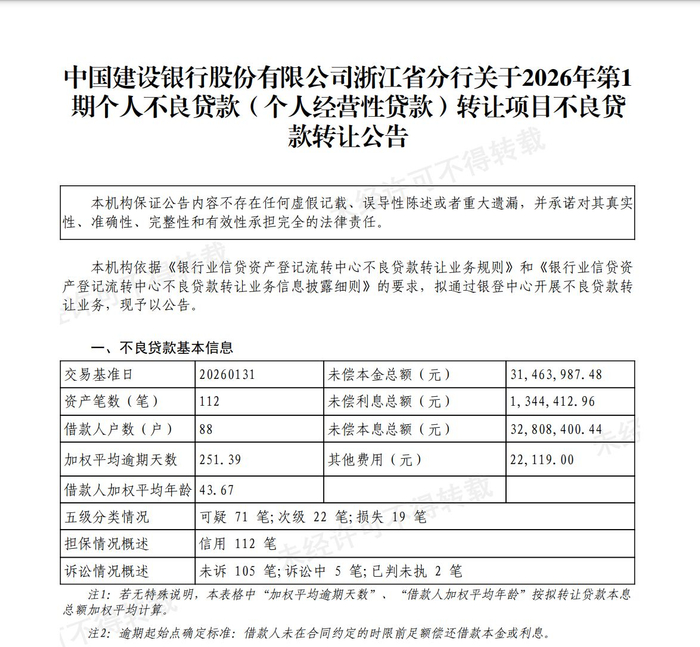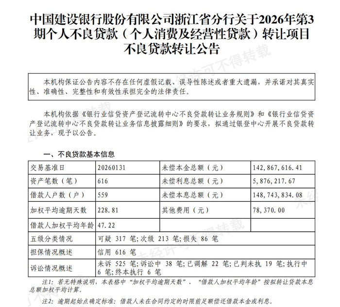 公告显示,建设银行浙江省分行挂出的3期不良贷款加权平均逾期天数分别为251天、307天、228天,未偿本息总额分别为0.33亿元、0.93亿元、1.49亿元,共计2.75亿元。