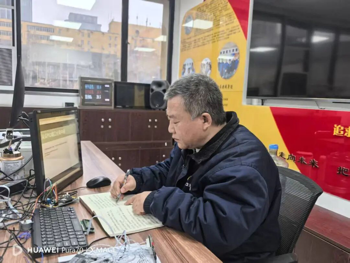 桌子上,各种线路板、线路图,占据了“半壁江山”。齐名紧盯着电脑,不时地暂停、回放、记录笔记。“公司新设备有这样的系统,早点学,以备今后用得着。”蓝色工装、花白头发,黑红的脸上随时带着温暖的笑容。