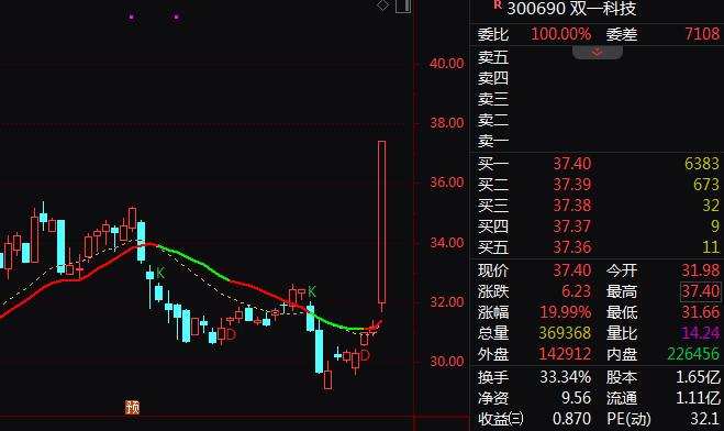 市场热点方面,新能源概念股午间集体异动拉升,风电设备方向领涨,板块指数中午收盘还跌近2%,午后一开盘就放量直线拉升,一度大涨逾6%,创近4年新高。双一科技午后垂直20%涨停,振江股份、大金重工下午开盘后均快速拉升至涨停。