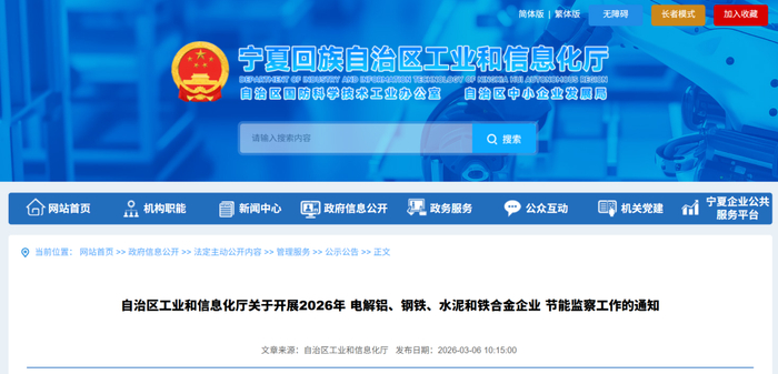 宁夏开展2026年电解铝、钢铁、水泥和铁合金企业节能监察工作
