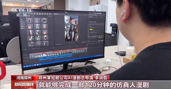 郑州某短剧公司AI漫剧总导演 李润哲:它发展非常迅速,成本是精品真人短剧的十分之一。它的制作周期非常短,需要的人数大概是十个人为一组,能在7到10天完成一部120分钟的仿真人漫剧。
