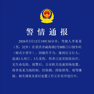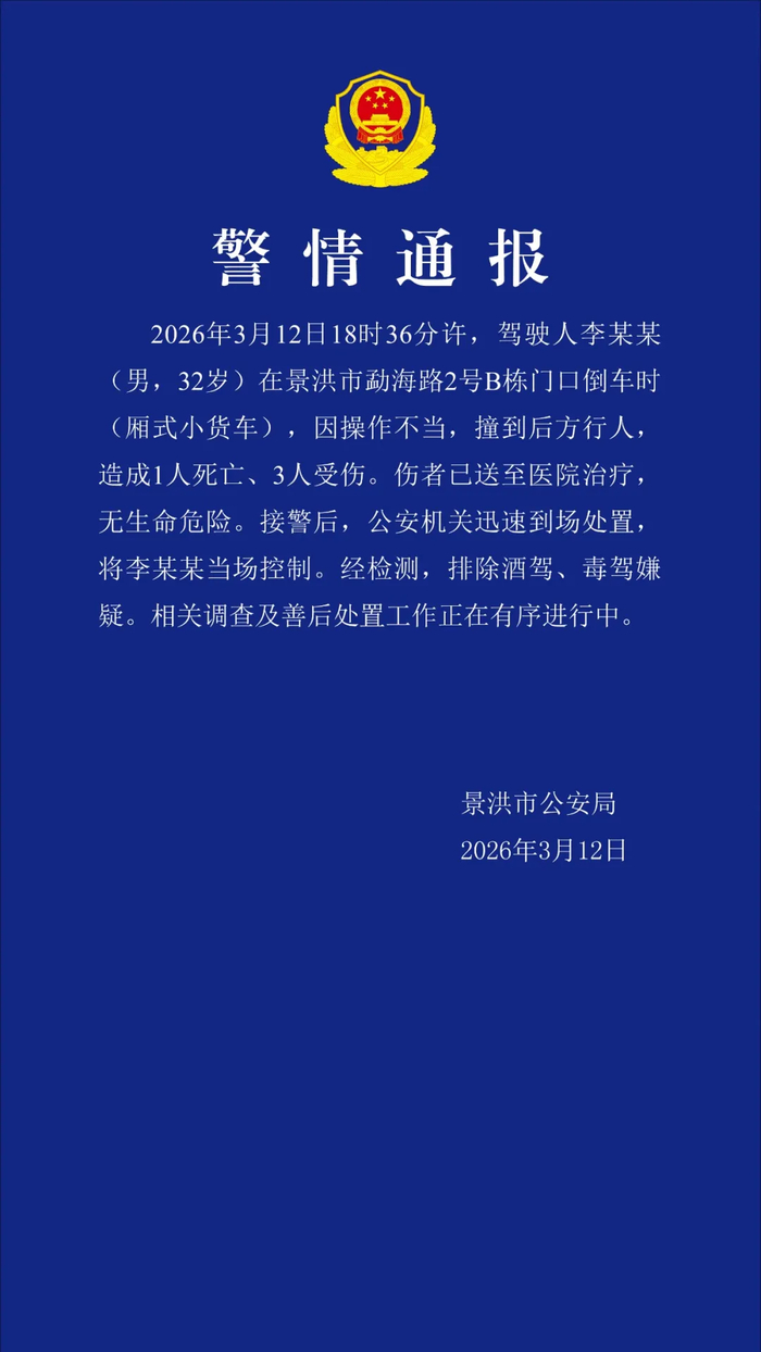 云南西双版纳州景洪市公安局3月12日晚通报:3月12日18时36分许,驾驶人李某某(男,32岁)在景洪市勐海路2号B栋门口倒车时(厢式小货车),因操作不当,撞到后方行人,造成1人死亡、3人受伤。伤者已送至医院治疗,无生命危险。接警后,公安机关迅速到场处置,将李某某当场控制。经检测,排除酒驾、毒驾嫌疑。相关调查及善后处置工作正在有序进行中。