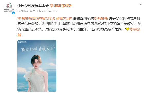 3月12日,@中国乡村发展基金会发文:感谢四川姑娘鞠婧祎携手小会长助力乡村孩子音乐梦想,为四川省凉山彝族自治州喜德县的2所乡村小学捐建音乐教室、配备专业音乐设备,用音乐滋养乡村孩子的童年,让音符照亮成长之路~