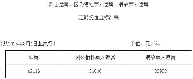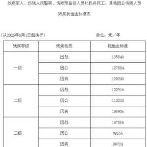标准调整后,各类优抚对象抚恤和生活补助标准较上年度均有提高。其中,一级因战、因公、因病残疾人员抚恤金分别提高至每人每年135840元、127884元、120240元,十级因公残疾人员抚恤金提高至每人每年12324元,烈士遗属、因公牺牲军人遗属、病故军人遗属、在乡复员军人、带病回乡退役军人、部分参战参试退役军人、部分老年烈士子女、部分年满60周岁农村籍退役士兵的抚恤金和相关补助金标准普遍提高。