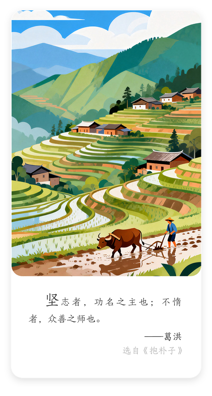 葛洪,东晋理论家、医药学家,代表作为《抱朴子》。此句大意为,意志坚定,是建功立业的根本;不懒惰,是一切善行的老师。