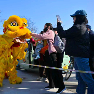 大集上,游客观看舞狮表演。记者 常鸣/摄