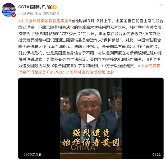 当地时间3月12日上午,由美国担任轮值主席的联合国安理会,不顾已随着相关决议的失效而对伊核问题无审议权,强行举行有关负责监督执行对伊朗制裁的“1737委员会”的会议。美国常驻联合国代表迈克·沃尔兹还指责俄罗斯和中国试图通过阻碍该委员会运作来“保护伊朗”。对此,中国常驻联合国代表傅聪大使当场严词驳斥。傅聪大使指出,是美国单方面退出伊核全面协议,引发伊核危机。也是美国置自身信誉于不顾,与以色列两度在与伊朗谈判进程中悍然对伊朗动武,导致外交努力付诸东流。美国作为伊核危机的始作俑者,其所作所为违反国际法以及《联合国宪章》宗旨和原则,中方予以强烈谴责。