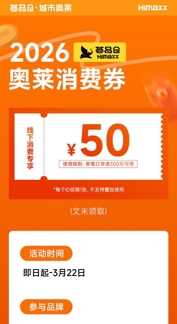 本次消费券由荟品仓城市奥莱官方发放