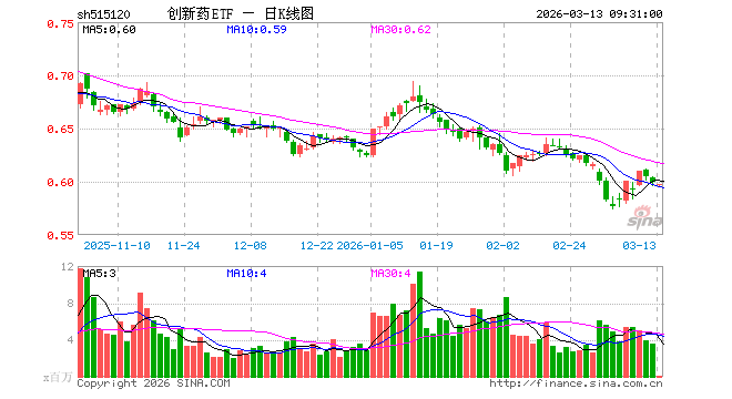 3月13日,创新药ETF(515120)开盘跌0.50%,报0.596元。创新药ETF(515120)重仓股方面,药明康德开盘跌0.83%,恒瑞医药涨0.00%,华东医药跌0.40%,复星医药跌0.58%,科伦药业跌1.00%,百济神州跌1.08%,长春高新跌0.24%,康龙化成涨0.67%,泰格医药跌0.38%,艾力斯跌0.38%。