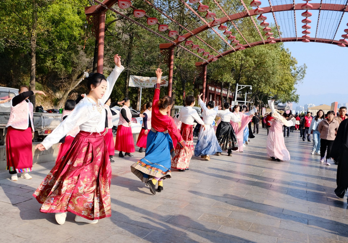 作为活动核心环节,踏歌迎春重现古时迎春盛景,这一兴于汉、盛于唐的传统歌舞形式,在女皇故里利州随“女儿游河湾”民俗延续至今,成为全民参与的春日郊游活动。现场身着唐装汉服的市民裙裾飞扬踏歌起舞,围观群众也纷纷加入,大家在欢快的旋律中放下负担,感受传统文化的魅力,尽享简单快乐。
