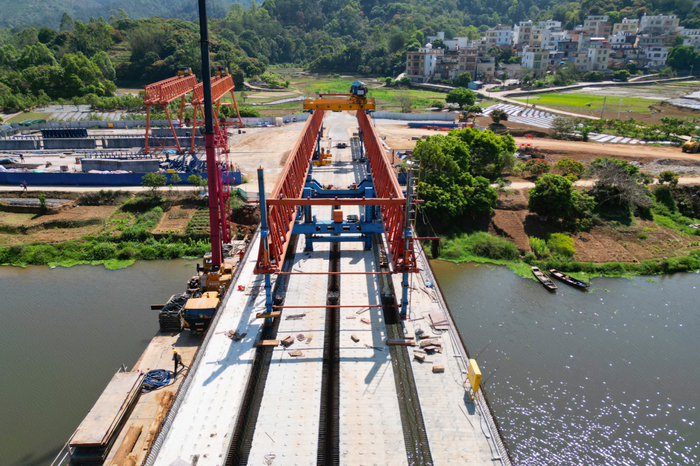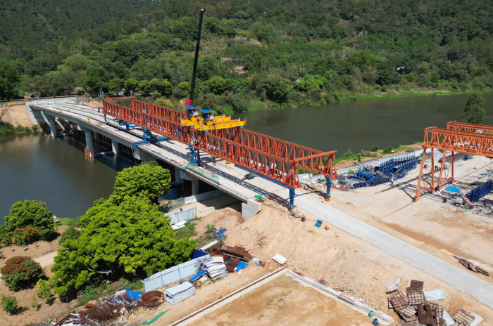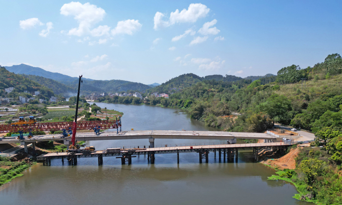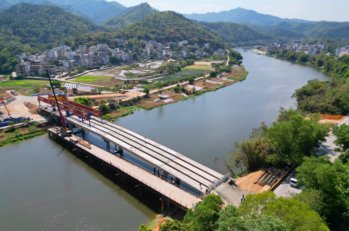 3月12日,春光明媚。记者来到郁南县南江口镇河塱村,只见南江河上,架桥机、大型吊车不停运转,工人们正加紧进行路基施工、护栏安装和桥面附属工程建设,一座崭新的大桥雏形已现。