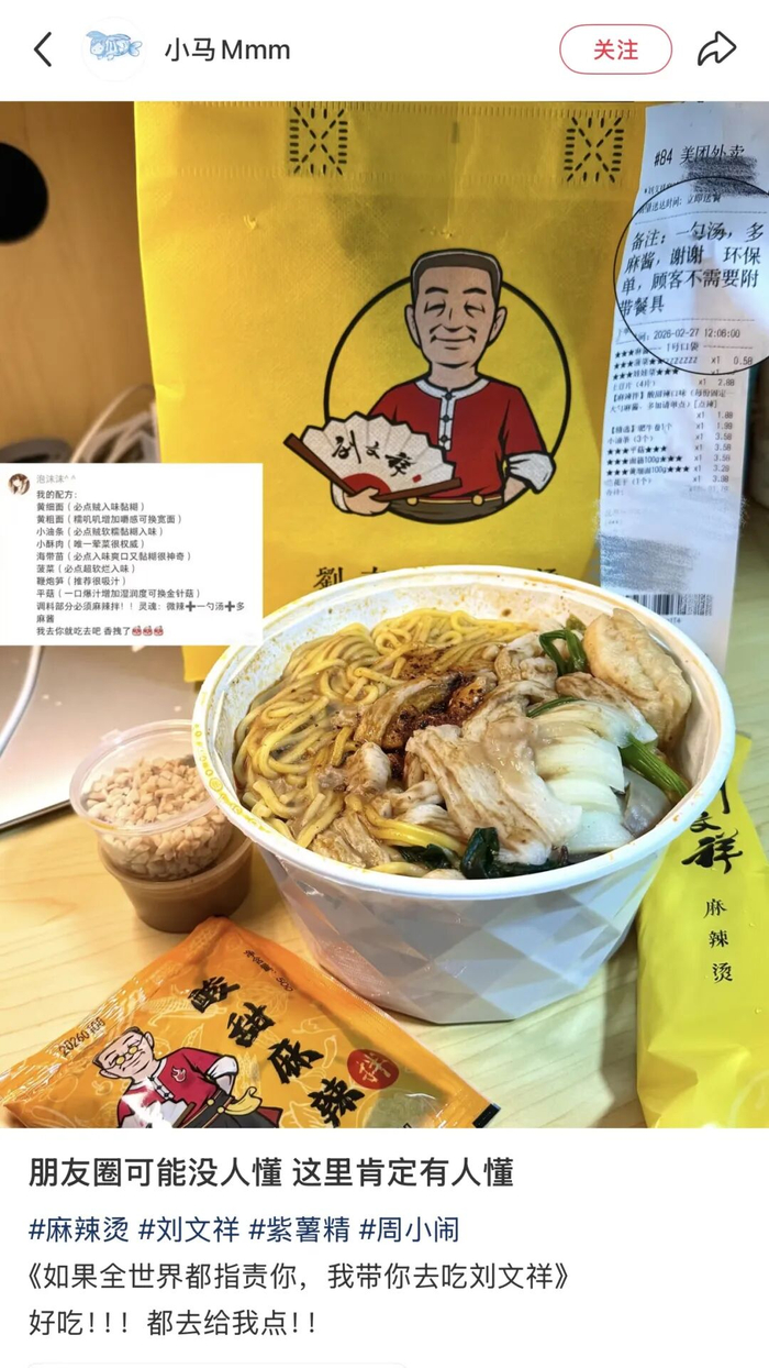 抖音博主“周小闹”凭借《饭店寒假工》系列短剧中的“紫薯精”角色,意外带火了刘文祥麻辣烫。一句“如果全世界指责你,我带你去吃刘文祥”,引发全网打卡潮 / 图源小红书博主@小马Mmm(已授权)