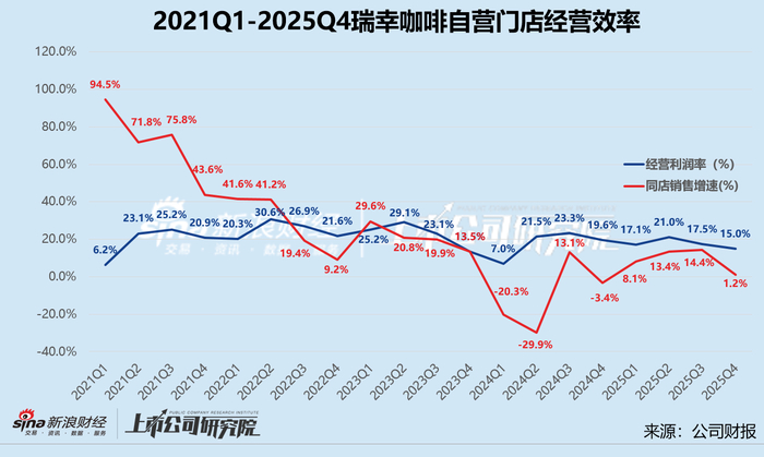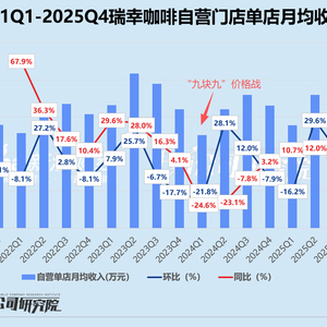 用户端压力传导至门店层面。截至2025年末,瑞幸咖啡旗下共有自营门店20234家,第四季度合计实现自营净收入95.47亿元。基于此简单推算,2025年10-12月,其自营门店单店月均收入约为15.73万元,与第三季度相比骤降19.6%,较2024年同期减少4.8%,基本跌回2022年第四季度同等水平。这是自2022年以来,瑞幸自营门店单店月均收入第二次出现同、环比双降,而上一次发生在2024年第一季度,正是“九块九”价格战正酣之际。报告期内,公司自营门店同店销售额同比仅微增1.2%,与2025年第二季度和第三季度的13.4%、14.4%增速相去甚远。