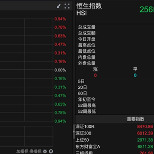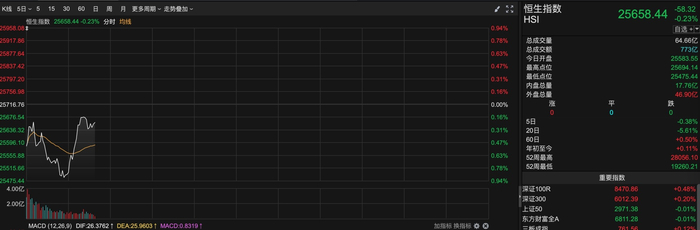 截至发稿,恒生指数开盘报25658.44点,下跌58.32点,跌幅0.23%。
