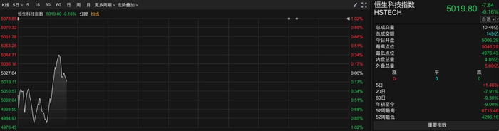 恒生科技指数开盘报5009.53点,跌幅0.36%,随后小幅回升,截至发稿报5019.80点,跌幅收窄至0.16%。