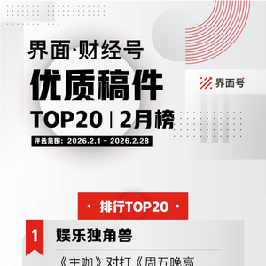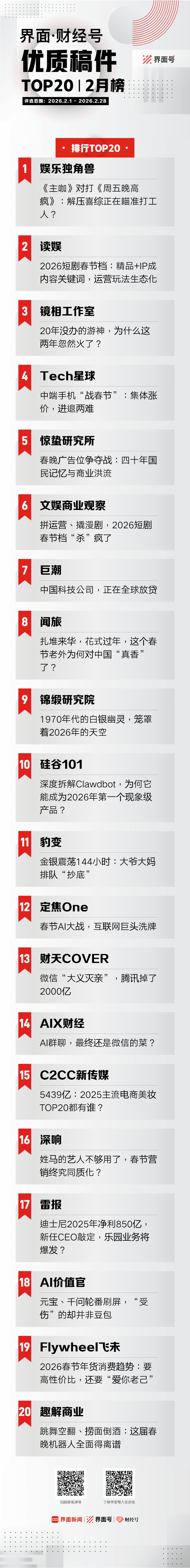 行走烟火人间,穿越四季光阴,界面·财经号1000多位成员立足于现实生活,持续观察千姿百态的商业现象,破解商业世界背后的秘密,在2026年2月1日至2月28日期间累计发文近2000篇。其中,以下20篇稿件脱颖而出,荣登《界面·财经号优质稿件TOP20|2026年2月榜》,用原创彰显独立思考的力量。