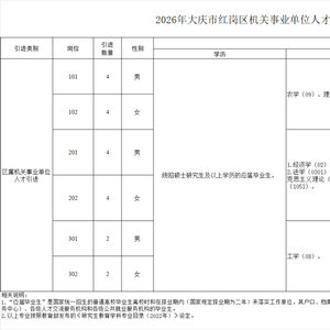 本次区属机关事业单位引进人才20人。具体引进岗位、数量和要求详见《2026年大庆市红岗区机关事业单位人才引进计划表》(附件1)。