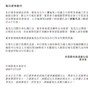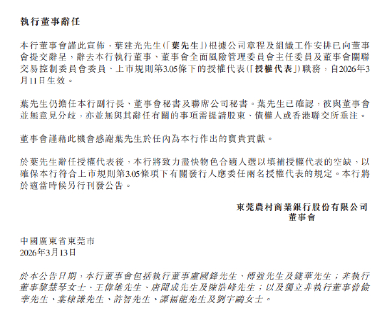 3月13日金融一线消息,东莞农商银行发布公告称,叶建光根据公司章程及组织工作安排已向董事会提交辞呈,辞去本行执行董事、董事会全面风险管理委员会主任委员及董事会关联交易控制委员会委员、上市规则第3.05条下的授权代表(授权代表)职务,自2026年3月11日生效。