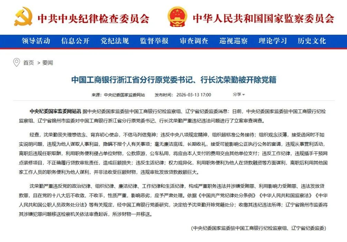 据中央纪委国家监委驻中国工商银行纪检监察组、辽宁省纪委监委消息:日前,中央纪委国家监委驻中国工商银行纪检监察组、辽宁省锦州市监委对中国工商银行浙江省分行原党委书记、行长沈荣勤严重违纪违法问题进行了立案审查调查。