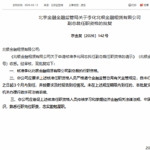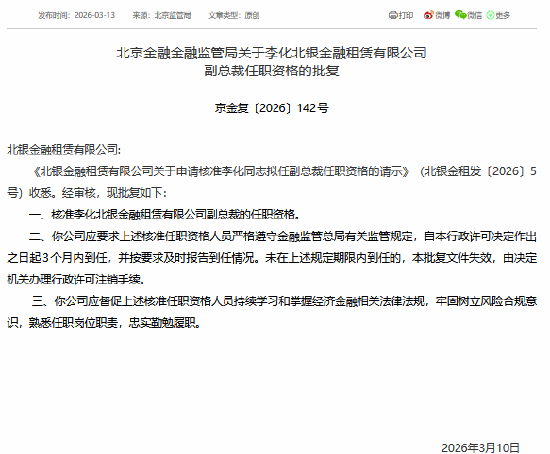 3月13日金融一线消息,北京金融金融监管局发布《关于李化北银金融租赁有限公司副总裁任职资格的批复》,核准李化北银金融租赁有限公司副总裁的任职资格。