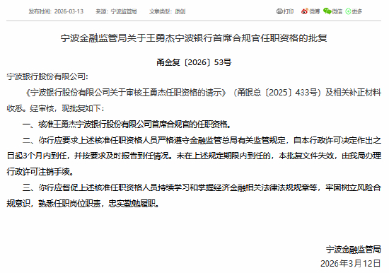 3月13日金融一线消息,宁波金融监管局发布《关于王勇杰宁波银行首席合规官任职资格的批复》,核准王勇杰宁波银行股份有限公司首席合规官的任职资格。