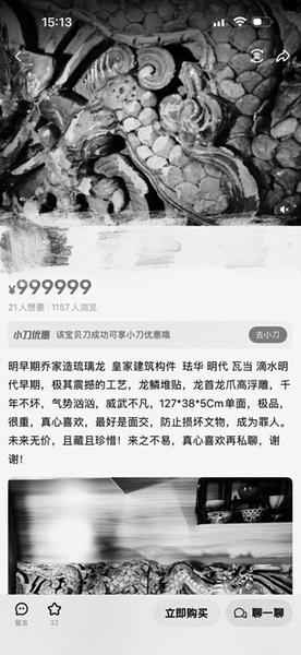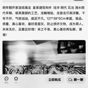 一卖家将一件标注为“明早期乔家造琉璃龙”的商品标价999999元。其在商品介绍里称,这是皇家建筑构件,“极品,很重,真心喜欢,最好是面交,防止损坏文物,成为罪人。未来无价,且藏且珍惜!来之不易,真心喜欢再私聊。”
