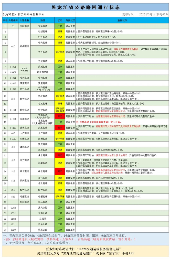 2.鹤哈高速(双丰至伊春站),封闭。省内其它高速路况正常。