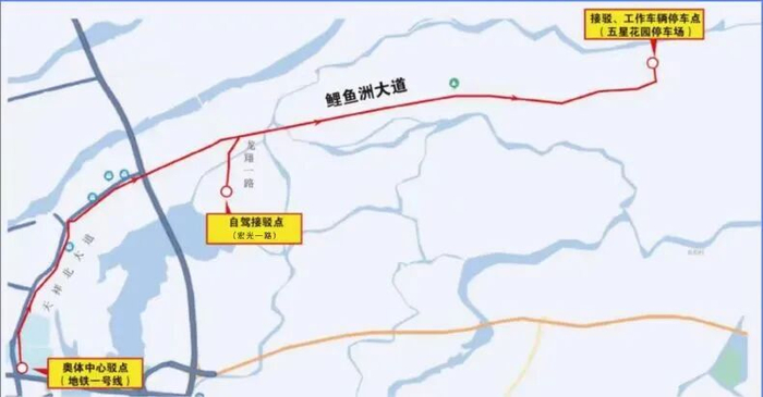 2.车辆途经自驾车停车场,终点到达地铁1号线奥体中心站1号口,请参赛人员根据需求下车。