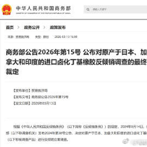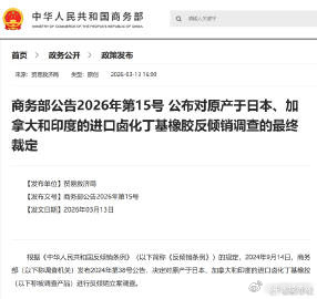 商务部公告2026年第15号 公布对原产于日本、加拿大和印度的进口卤化丁基橡胶反倾销调查的最终裁定