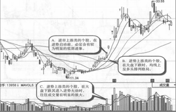 B.逆势上涨类的个股,在大盘下跌时,均线上呈多头排列格局。