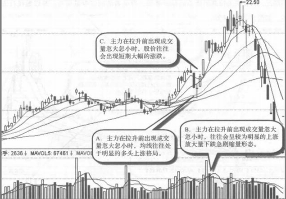 A.主力在拉升前出现成交量忽大忽小时,均线往往处于明显的多头上涨格局。