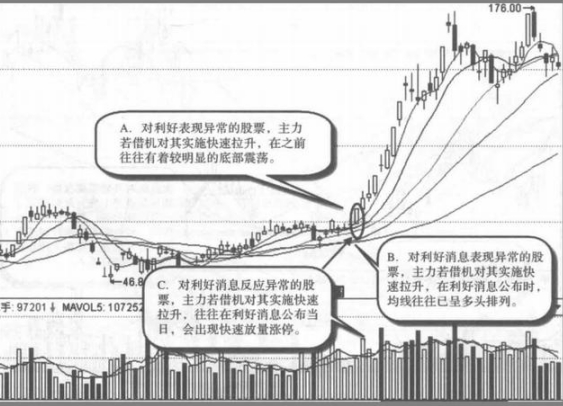 B.对利好消息表现异常的股票,主力若借机对其实施快速拉升,在利好消息公布时,均线往往已呈多头排列。