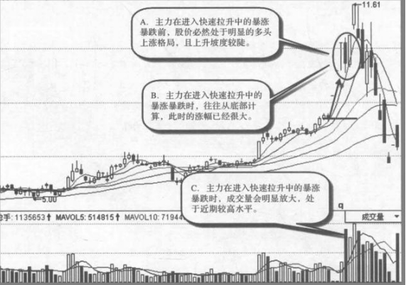 C.主力在进入快速拉升中的暴涨暴跌时,成交量会明显放大,处于近期较高水平。