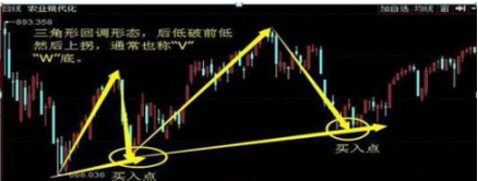 在回调的过程中会有很多形态,回调成三角形的一种形态,虽然是回调,但低点不能破前低,我们也称V或W底。