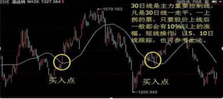 30日均线是一个非常重要的参考,大多数主力做盘也能通过30日均线得出参考,30日均线向下走平再上拐的,通常后续都会有大约10%以上的涨幅,短线操作用这个方法可以收到意想不到的效果,结合五日和十日均线效果更佳。