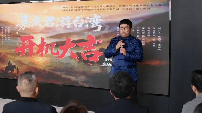 福建省百崎影视产业有限公司CEO潘融融代表园区致欢迎辞,表示百崎短剧园作为两岸影视文化合作试验区核心载体,致力打造两岸文化融合发展前沿阵地。这部《嘉庆君游台湾》扎根两岸共同记忆、传承中华文脉,正是两岸文化交流的生动实践。预祝开机大吉、拍摄顺利、佳作传世。