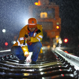 图为3月14日凌晨宝成铁路青白江站线路大机捣固施工中作业人员标记钢轨附属设备(青尧摄)