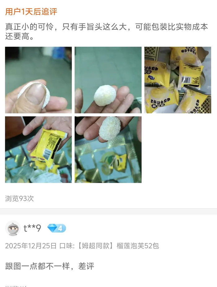 然而,记者调查发现,当实物出现在眼前时,几乎不敢相信自己的眼睛——实物仅手指指尖大小,直径约2厘米。这与评价区消费者吐槽的“小得可怜,包装比实物成本还高”“跟图一点都不一样”等内容完全一致。