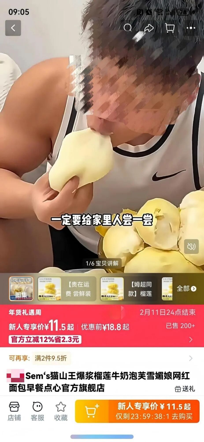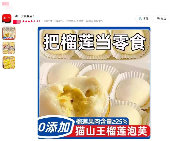 在某电商平台“澳一丁旗舰店”,一款“猫山王榴莲泡芙”正在直播间和详情页火热推广。商家宣称这是“猫山王爆浆、满满榴莲果肉、果肉含量≥25%”的极品美味。