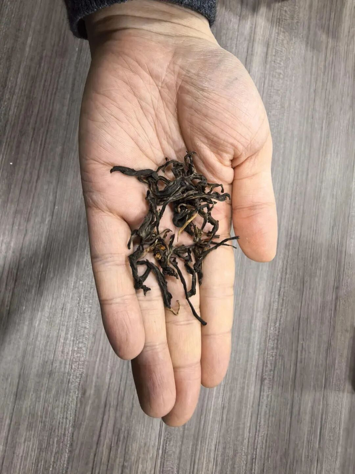 干茶形态严重不符——宣传中的干茶条索完整、色泽匀净;而实物干叶粗糙细碎,夹杂枯枝、碎末,毫无“金毫”可言,与“古树红茶”应有的条索紧结、匀整特征完全不符。