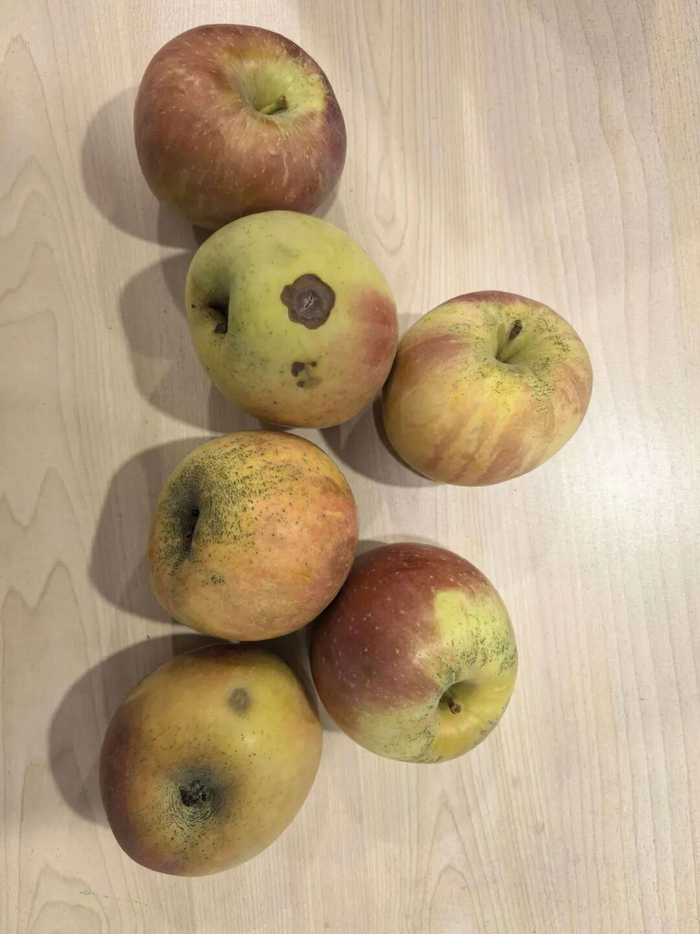 一共6个苹果,拨开网格袋,全是青黄色,布满黑斑,其中两个已经开始腐烂。