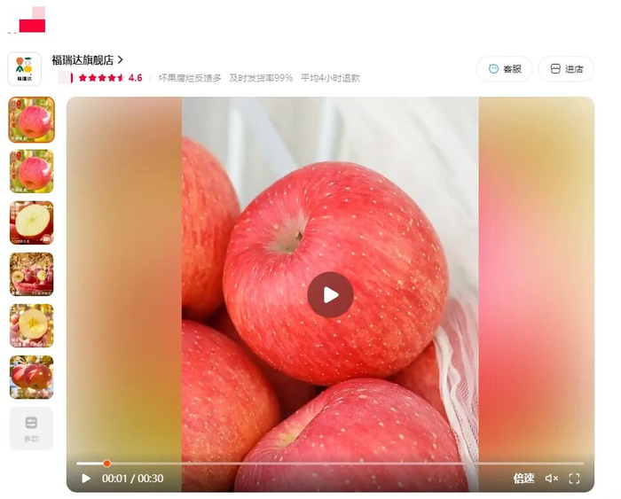 排在店铺首位的这款苹果,点进去便是一段精心编排的视频:通体红彤彤的大苹果码放整齐,水滴洒落,在果面上形成细小的水珠,泛着晶莹剔透的光泽。切开的果面,果汁沿着切口流淌,咬上一口的牙印里全是汁水。