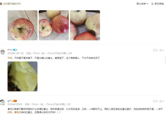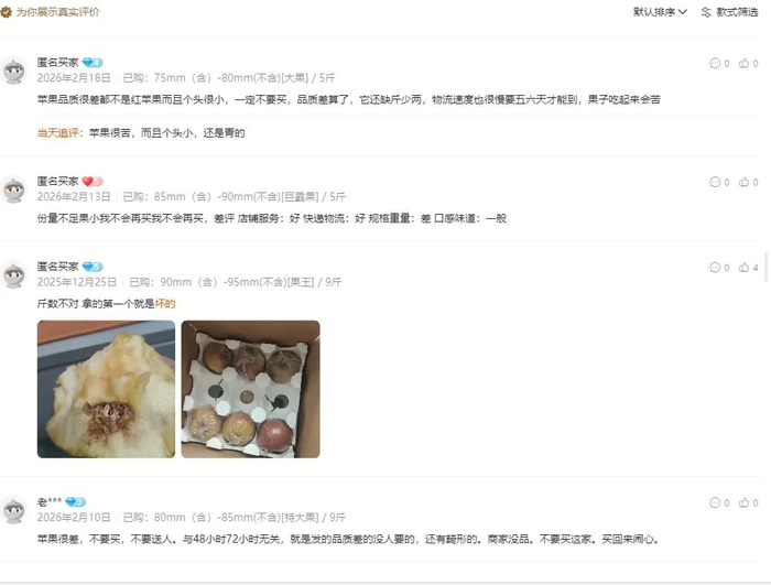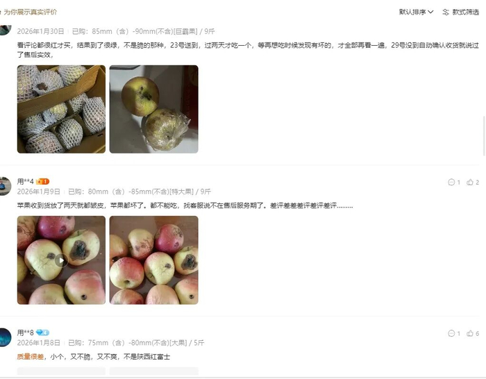 评价区里,“苹果都坏了,不能吃”“很差很差”“苹果很苦,而且个头小,还是青的”……类似的评价一个接一个。