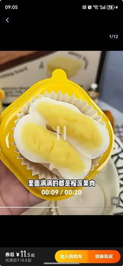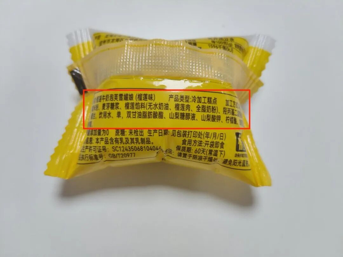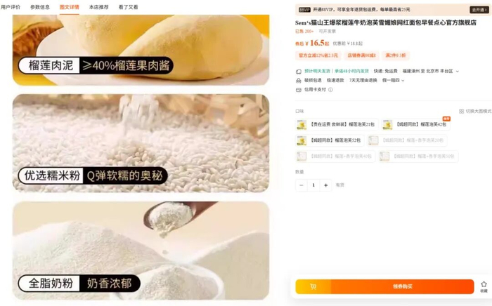 宣传图片同样精美:泡芙特写镜头中,榴莲果肉约占90%。配文更加令人垂涎——“0添加”“一口沦陷,榴莲暴击,巨上头的榴莲零食”“挖到宝了,这个榴莲泡芙雪媚娘‘敲’好吃”“大泡芙、榴莲夹心、幸福感爆棚”“榴莲果肉香萦绕舌尖,俘获味蕾”“Q弹软糯冰皮,日式大福工艺”“颗颗圆润饱满,软萌下的实力派”……