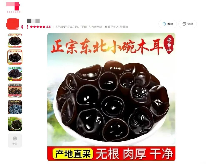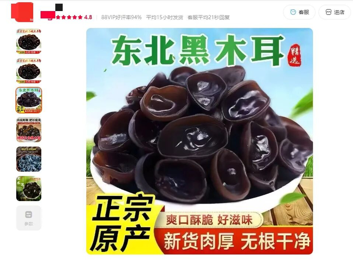 进入该商家页面,呈现在眼前的堪称视觉盛宴:黑木耳乌黑光润,朵形完整,形同复制,仿佛刚从长白山的深山里摘下,还带着一层薄薄的山林雾气。