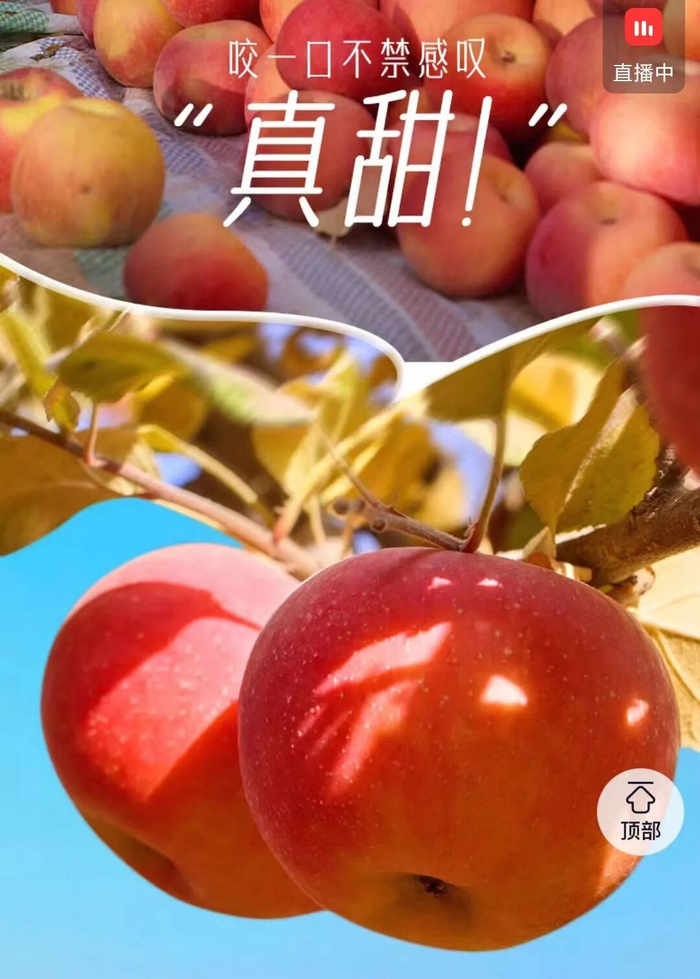 这段视频播放的是,在成片的苹果树林里,树上挂满了又大又红的苹果,视频底部,“福瑞达甄选”字样赫然在目。